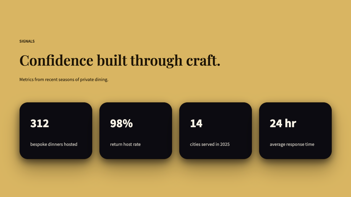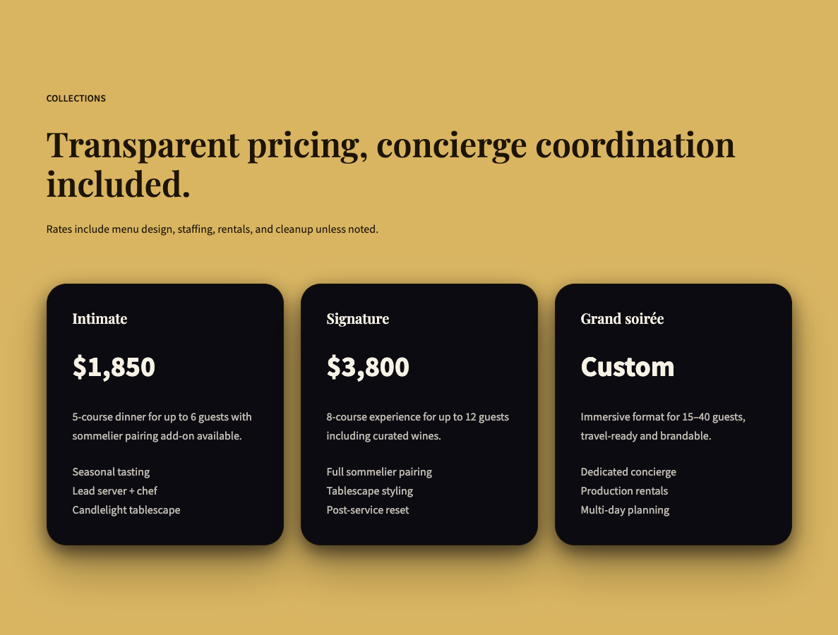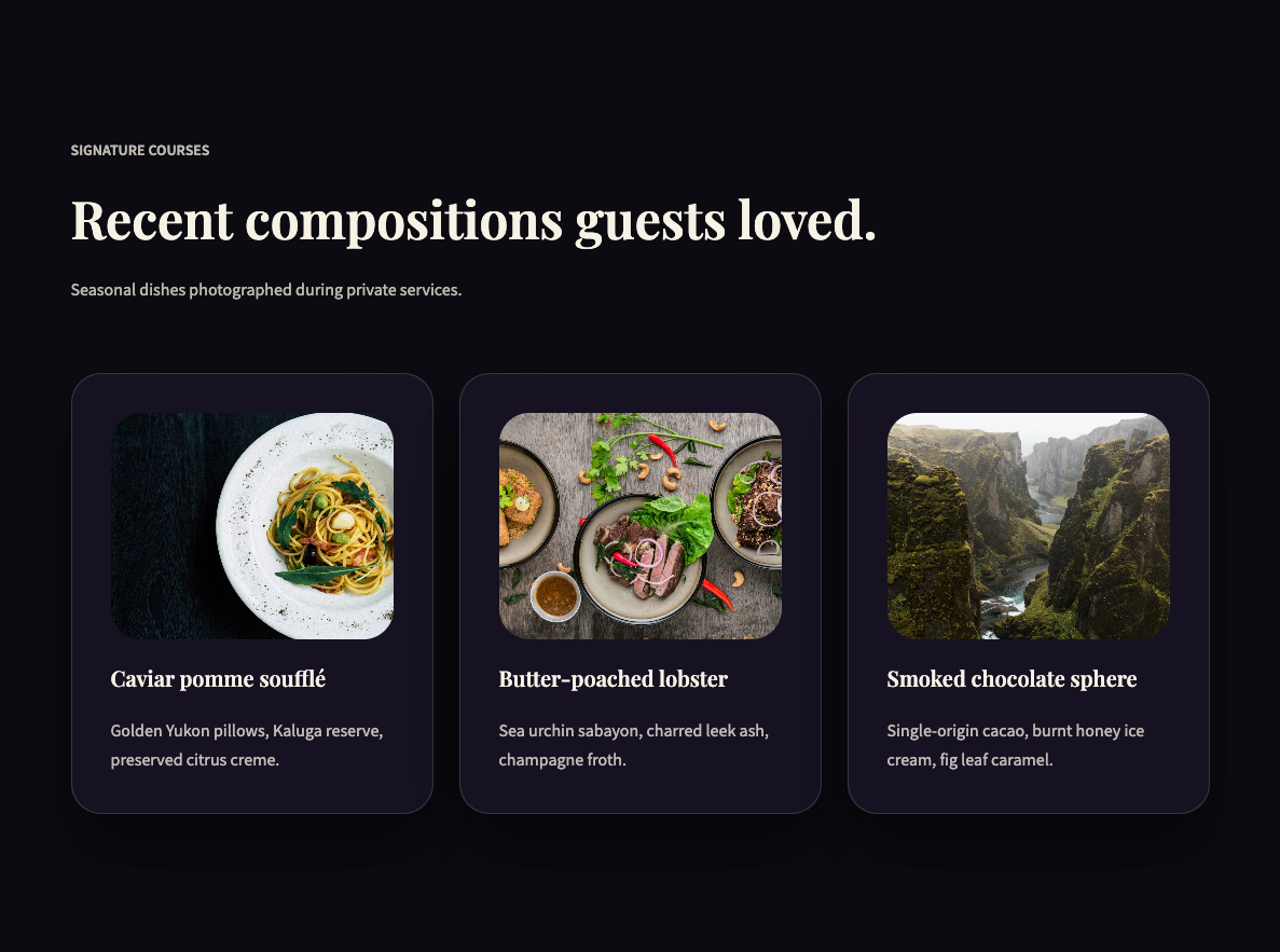 People usually want to know what you cook, where you work, and when you are available. A simple private chef website can also show dinner party menus, in-home service areas, and event dates before someone sends an inquiry.