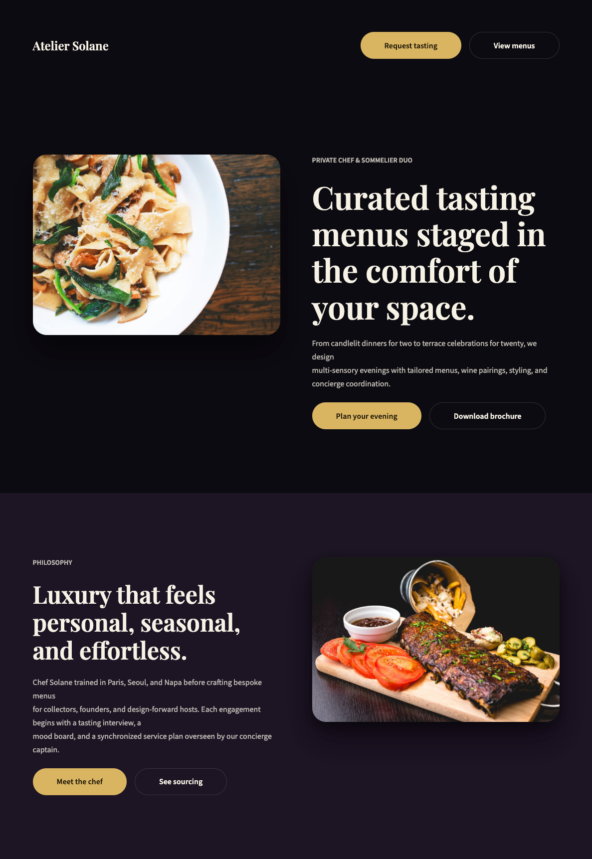 Start with a ready-made preset for a private chef site. Add, remove, and reorder sections, then change the text, images, fonts, and themes. It is free to build, pay to download.