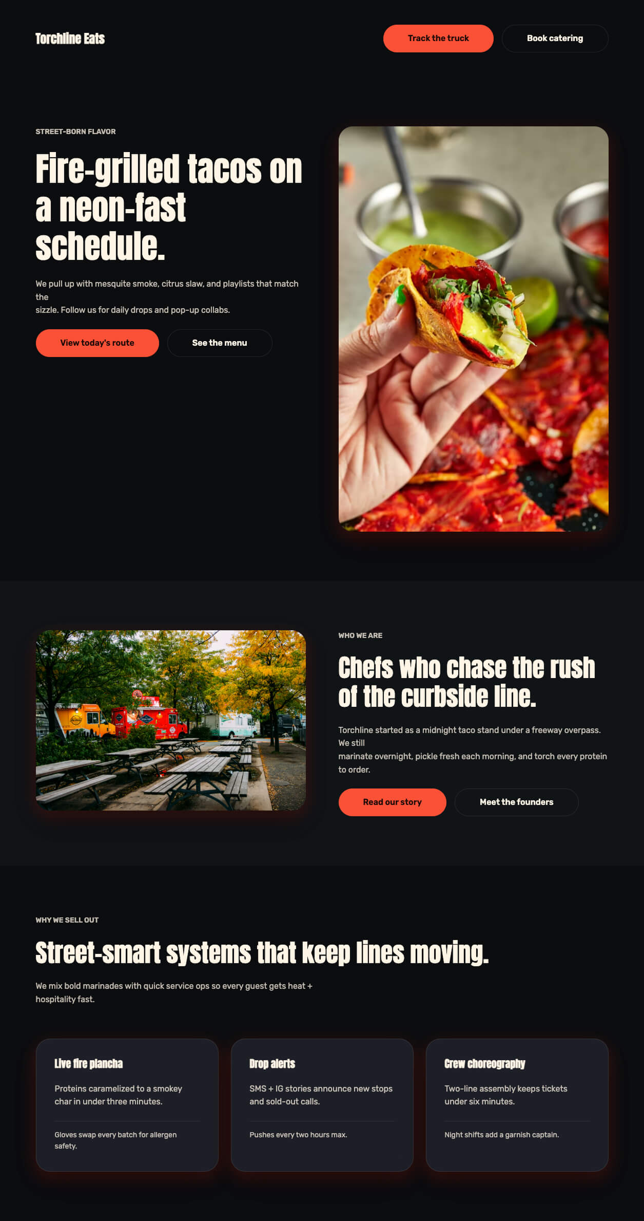 Start with a ready-made preset for a Food Truck site. Add or remove sections, reorder them, and edit the text, images, fonts, and theme. Build for free, then download when you're ready.
