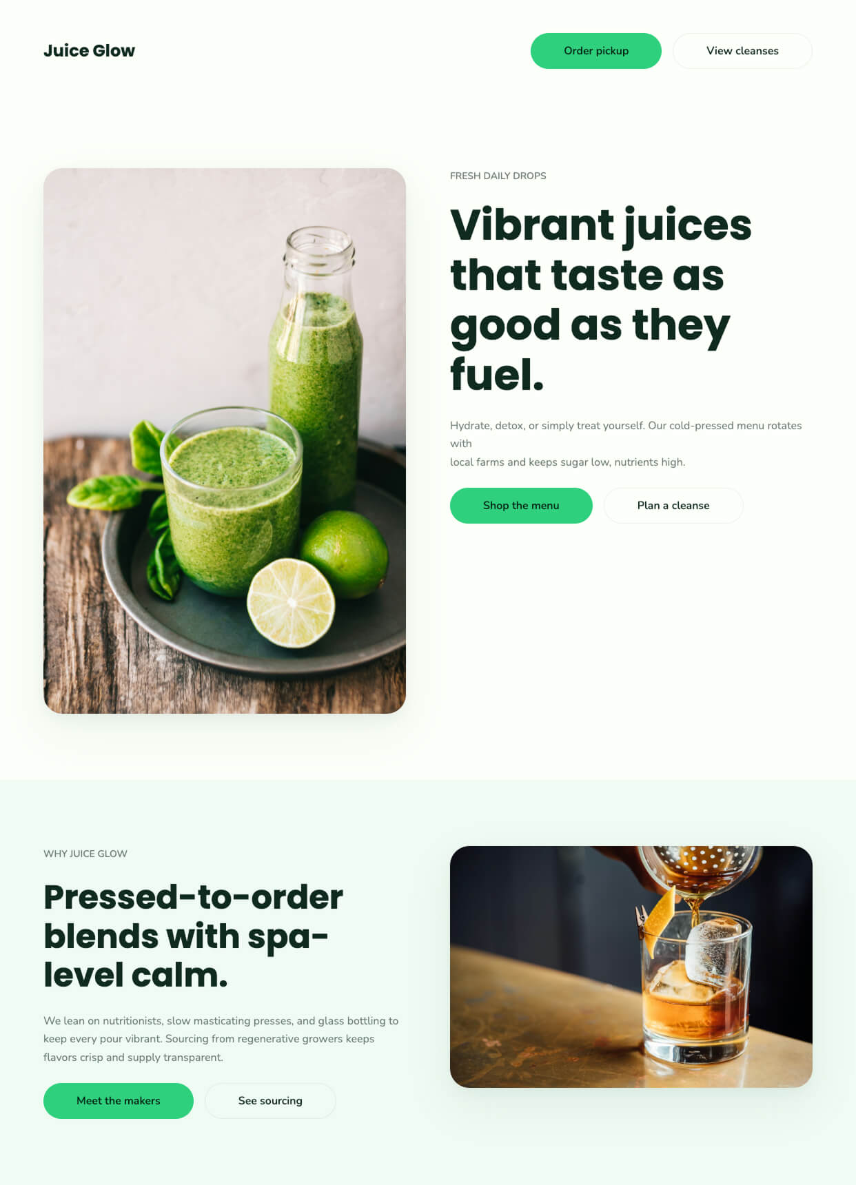 Start with a ready-made preset for a juice bar site. Add or remove sections, reorder them, and edit the text, images, fonts, and theme. It is free to build, pay to download.